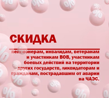 Скидка для пенсионеров, инвалидов (I, II, III групп), ветеранов и участников ВОВ, участников боевых действий на территории других государств, ликвидаторов и участников ЧАЭС.